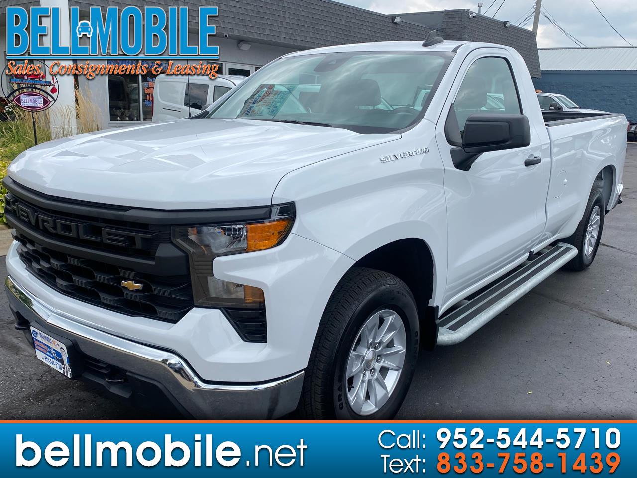 This One Owner, Low Mileage, 2024 Chevrolet Silverado 1500 Reg. Cab. Pickup 2WD is equipped w/White Exterior w/Jet Black Cloth Interior, 5.3L V8 Engine w/Push Button Start, Automatic Transmission w/Overdrive, Air Conditioning, Cruise Control, Tilt, AM/FM/AUX Stereo Radio, Bluetooth, Apple Car Play, Android Auto, Power Windows, Locks, Mirrors, Anti-Lock Brakes, Rear Vision Camera, Remote Keyless Entry, Running Boards, Plus all Standard Options, Plus More. Well Maintained & Serviced. SERVICE RECORDS Available on CARFAX.Com. Free CARFAX Vehicle History Report Available Upon Request. Balance of GM Factory Warranty. Call for More Details! Financing Available with Approved Credit. BellMobile Sales & Leasing, The Place for Buying, Selling, and Leasing Vehicles! Visit BellMobile Inc. online at www.bellmobile.net to see more pictures of this vehicle or call us at 952-544-5710 today to schedule your test drive!